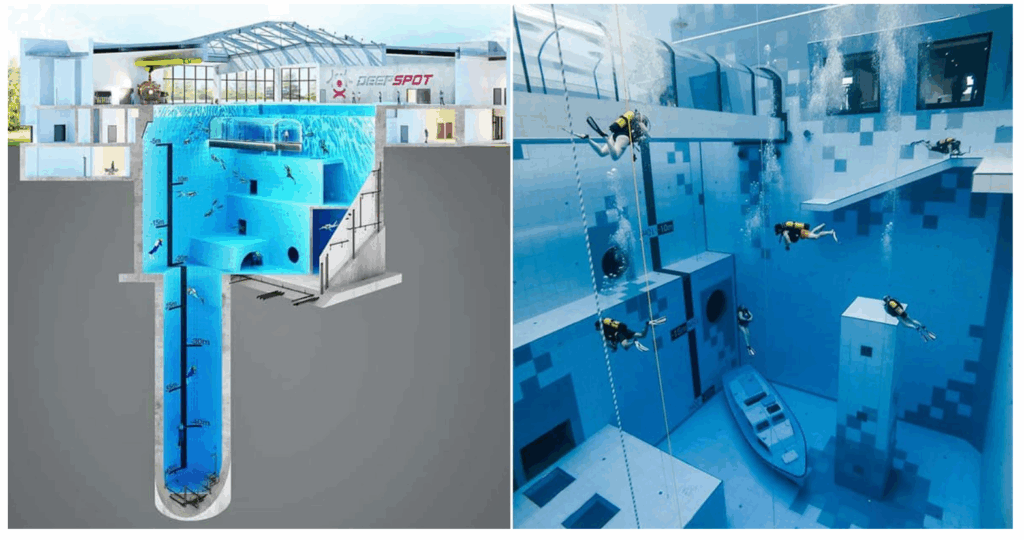 Přidejte se k nám na potápění v polském Deepspot bazénu s maximální hloubkou 45,4m, teploučkou vodou (33st), spoustou atrakcí, vrakem auta a lodi a dokonce i několikapatrovou umělou jeskyní.